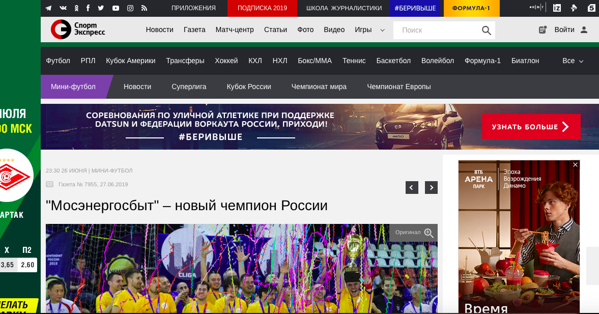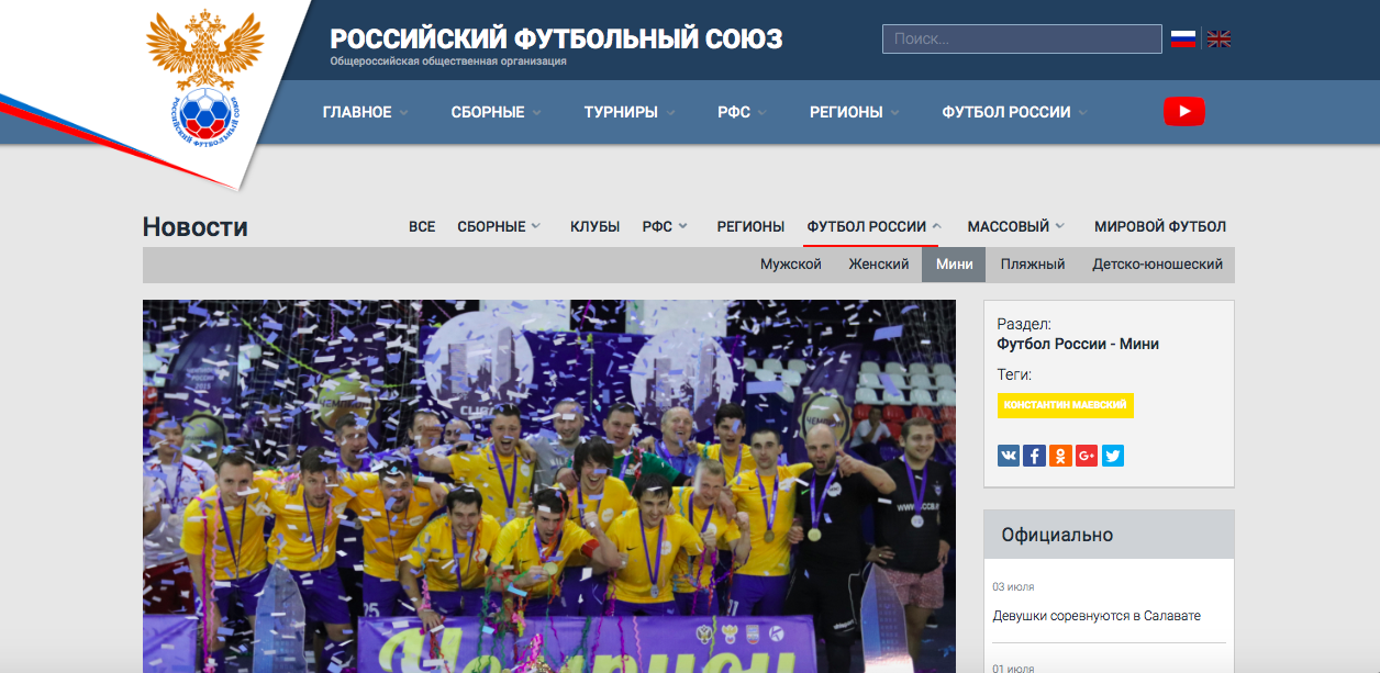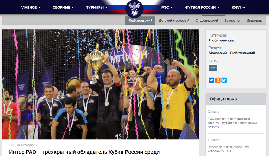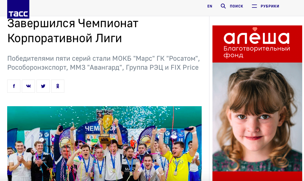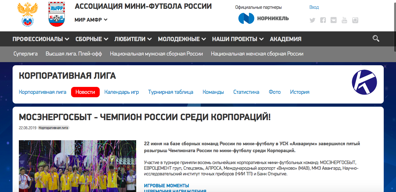 ТАСС, 1 декабря (Закрытие Чемпионата КЛ по мини-футболу 2019/2)Официальный сайт АМФР, 22 июня (V Чемпионат России среди корпоративных команд)Официальный сайт РФС, 22 июня (V Чемпионат России среди корпоративных команд)Спорт-Экспресс, 22 июня (V Чемпионат России среди корпоративных команд)Официальный сайт РФС, 6-7 октября (IV Кубок России среди корпоративных команд)Рамблер, 6-7 октября (IV Кубок России среди корпоративных команд)Спорт-Экспресс, 6-7 октября (IV Кубок России среди корпоративных команд)АРБ, 27 мая (Закрытие Чемпионата КЛ по мини-футболу 2018/1)Рамблер, 27 мая (Закрытие Чемпионата КЛ по мини-футболу 2018/1)Рамблер, 14-15 апреля (X Спартакиада Банка России)АРБ, 14-15 апреля (X Спартакиада Банка России)Рамблер, 3-4 марта (XXV Чемпионата Корпоративной Лиги по мини-футболу)Спорт-Экспресс, 22-23 октября (III Кубок России среди корпоративных команд) |